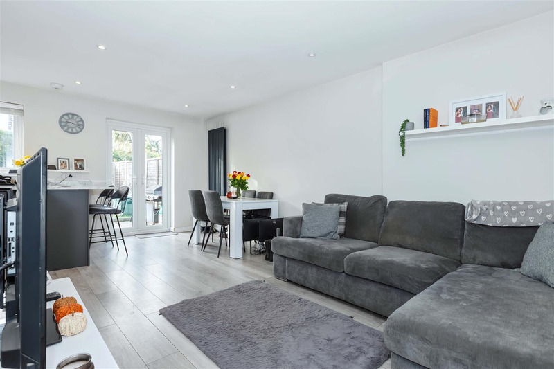 The property features a spacious open-plan lounge and dining area with doors leading to a south-facing rear garden, a modern kitchen with Bosch appliances and breakfast bar, a refitted shower room, and a well-proportioned double bedroom.