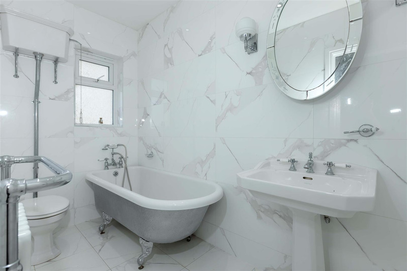 A contemporary main bathroom is finished to a high standard, featuring marble-effect tiling, a luxurious roll-top bath, wash hand basin, WC, and heated towel rail—creating a relaxing and refined space.