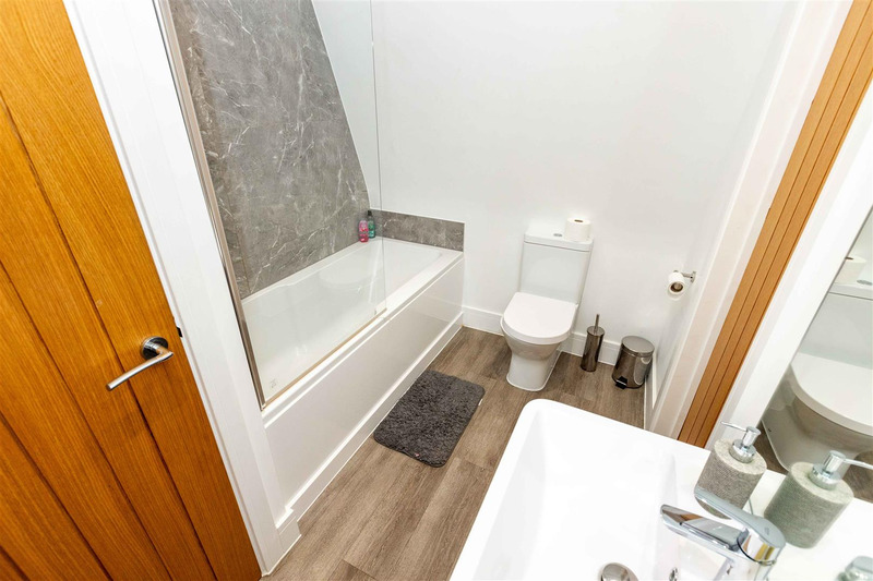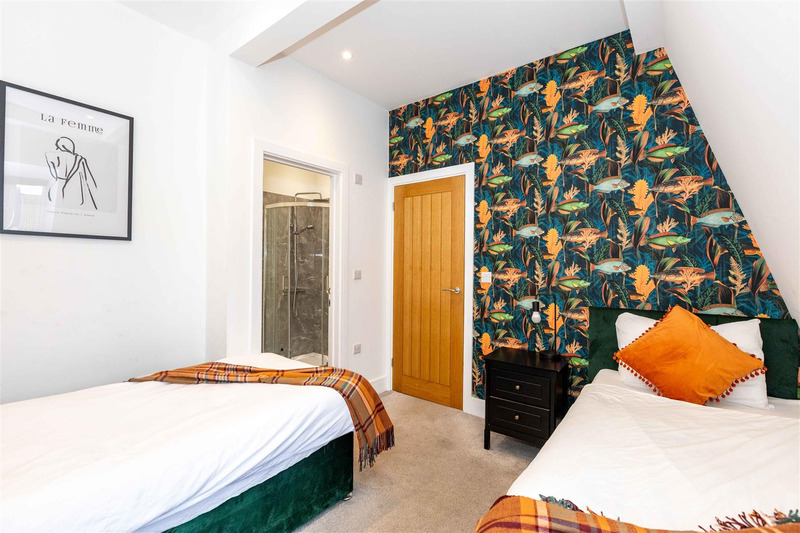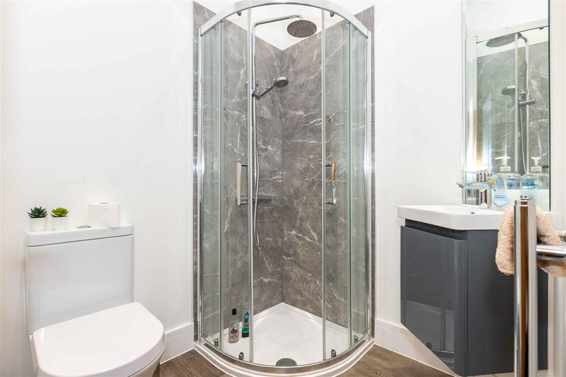 There are TWO LARGE BEDROOMS WITH EN-SUITE FACILITIES with grey carpets.