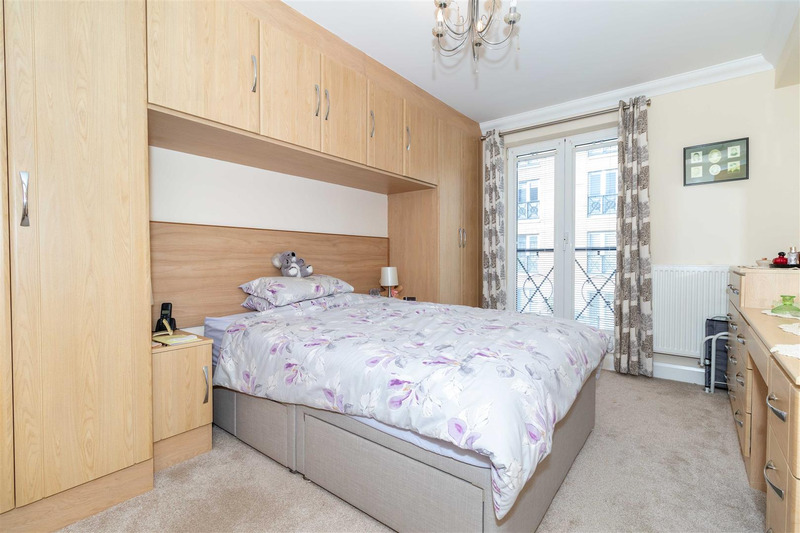The accommodation comprises a welcoming entrance hall with built-in storage, a generous living room, and a stylish kitchen/breakfast/dining room. There are two double bedrooms, including a principal suite with dressing area and en suite bathroom and Juliet balcony's to both bedrooms, together with a further family shower room. Additional benefits include secure garaging and permit parking for one space in the courtyard, a feature full length balcony with sea views, and access to the exclusive residents’ swimming pool.