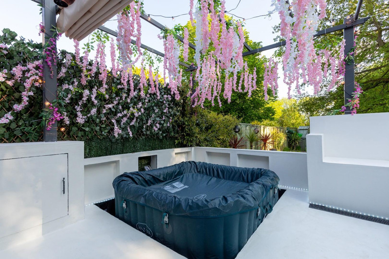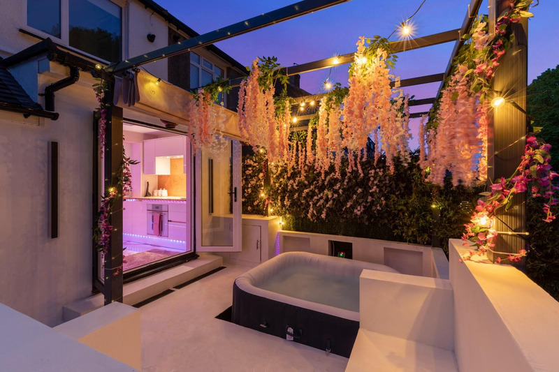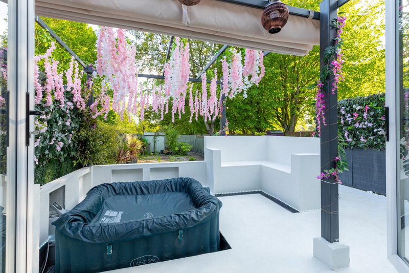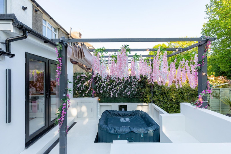 Offering bright and spacious living areas, a stunning modern kitchen, and three well-proportioned bedrooms, the home perfectly balances modern living and practicality. The landscaped South facing garden includes a hot tub, providing a serene retreat, ideal for entertaining or relaxing outdoors.
